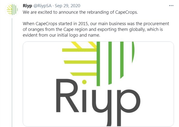 Announcing the rebranding of CapeCrops in September last year. The logo depicts an aerial view of an orchard (source: Riyp Twitter account)