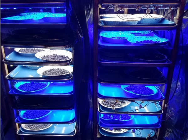 Postharvest blueberries were tested under blue light to determine whether the light affected fruit quality or disease development. Image: University of Georgia