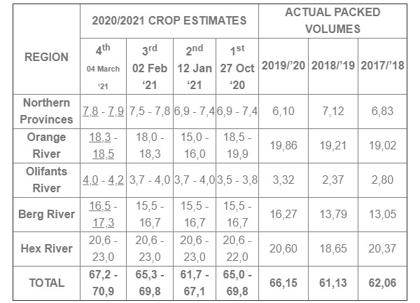 The estimate for the Northern Provinces was increased to between 7,8 and 7,9 million cartons and for the Orange River to between 18,3 and 18,5 million cartons. The Olifants River was adjusted to between 4,0 and 4,2 million cartons and the Berg River to between 16,5 and 17,3 million cartons. The estimate for the Hex River region remains unchanged.