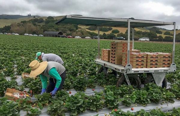 StrawBot keeps pace with the human pickers as they work down a row of strawberries during harvest season. Image: Ag Pro Robotics