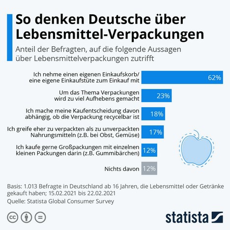 Almost two-thirds of Germans take their own shopping basket or shopping bag with them when they go grocery shopping. This is shown in the chart based on an exclusive survey by the Statista Global Consumer Survey on the topic of sustainable consumption.