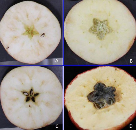 Symptoms of moldy core of Sweet Tango apples caused by Alternaria arborescens. A) Non-infected fruit; B) Naturally-infected fruit (mild infection); C) Naturally-infected fruit (moderate infection); D) Naturally-infected fruit (severe infection.