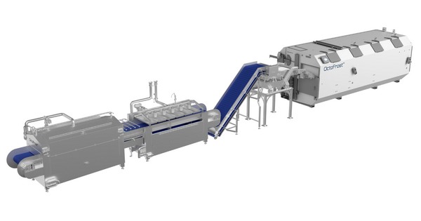There is timing in everything, even in IQF processing leafy greens: “Leafy greens should be chilled immediately after being blanched to achieve the best texture and color possible. The OctoFrost IF Chiller is equipped with the same rain shower system; instead, ice-cold water gently falls over the product for a quick and even chilling. The temperature in OctoFrost™ IF Chiller is always kept under the critical 6 C° to inhibit bacteria growth.” Hultin explains.