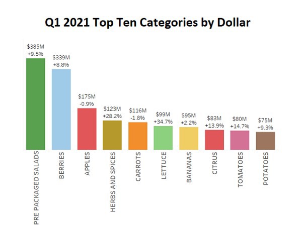 The top 10 organic produce categories continued performing very well, with eight of the top 10 categories generating increases in dollars and volume. Of these top categories, only organic carrots and apples failed to generate year-over-year dollar and volume gains during Q1.
