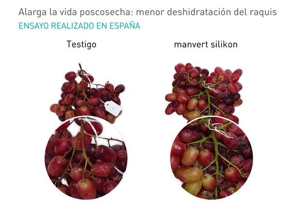 In grapes, the application of manvert silikon translates into a notable reduction of rachis dehydration and shelling.