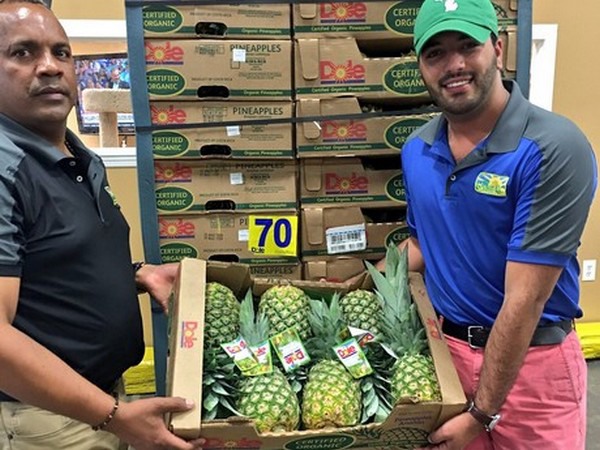 Nicolas Sanchez and Anthony Serafino show a box of pineapples.