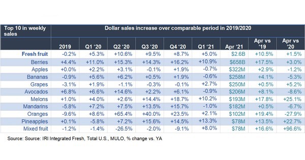 Only five out of the top 10 selling fruits lost ground versus the tremendous sales spikes of 2020, being apples, bananas, avocados, mandarins and oranges. Berries are a notable exception: in addition to being the biggest seller, they still managed robust sales increases both compared to the 2019 pre-pandemic normal (+10.5 percent) and the year-on-year view (+1.5 percent). While oranges were not able to hold on to the very strong April 2020 results, they are certainly still doing very well against normal levels, up 19.4 percent.