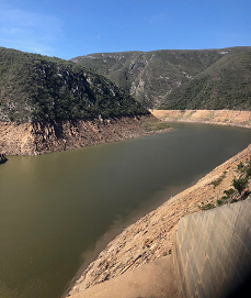 The Kouga Dam (right) is 4.3% full, and a mere 0.05% of its water is released every day to all of its water users. About half of the farmers in the area have always had access to the low quality water from the Gamtoos River, which is what has pulled many of them through years of drought, but in places the river has run dry and the quality has become almost unusable.
