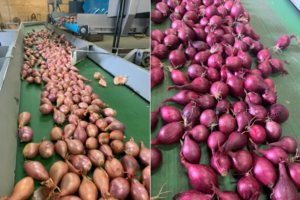 Left: Shallots being packaged on the Tomra optical sorter. Right: red onions.