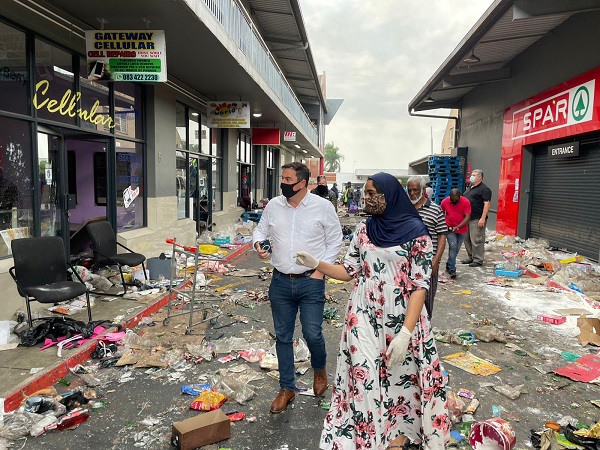 John Steenhuisen of the Democratic Alliance, the country's official opposition, visiting the devastation in Durban, KwaZulu-Natal, today. He exhorted other political leaders and police leadership to do the same (source Twitter Roman Cabanac)