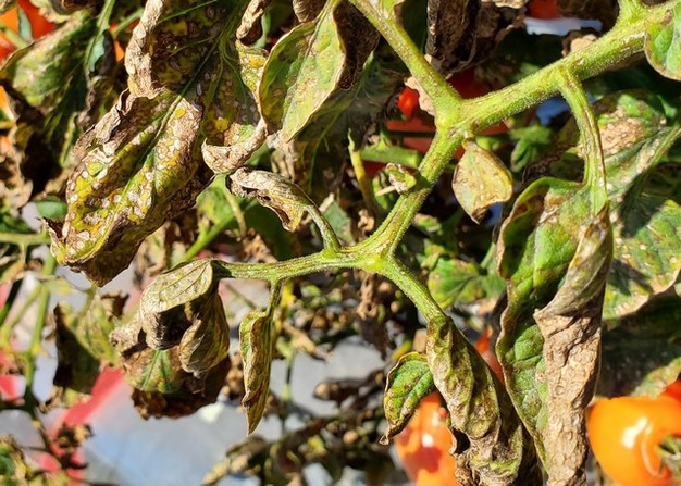 Bacterial cells enter leaves, fruit and stems through natural openings and injured tissue. Thereafter, a wide variety of symptoms are observed, depending on the specific pathosystem. Infected pepper and tomato plants are known to exhibit lesions on foliage, stem (figure 1.) and unripe and ripe fruit (figure 2.). Lesions can render fruit unmarketable, while severe foliar infections can cause defoliation, leading to sunscald of fruit and overall plant deterioration (figure 3.). Symptomology is like that on pepper and tomato, including corky lesions on fruit, leaves and woody stems. Citrus fruit exhibiting cankers are unsalable for fresh market and can drop prematurely under high disease pressure. Bacterial spot on peppers and tomatoes is caused by four species of Xanthomonas: X. euvesicatoria, X. gardneri, X. perforans and X. vesicatoria. Citrus canker, caused by X. axonopodis pv. citri, is one of the most pressing diseases among citrus spp. worldwide.