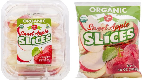 For schools/foodservice, Fresh Innovations California offers bulk organic apple slices in a variety of sizes, from single serve 2oz bags up to large bulk 3lb saddle packs. For retailers, it a prize slice 10oz bag of organic apple slices and prize slice clamshell multipacks that are a 5-pack of 2oz bags.