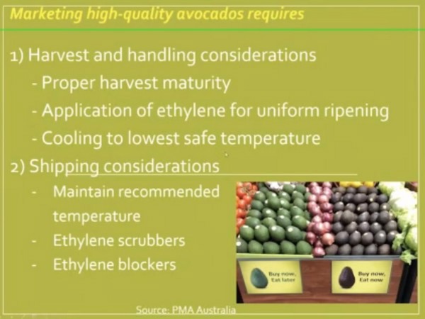 Sargent notes that marketing high quality avocados requires harvesting and handling at proper maturity. “So applying ethylene for uniform ripening and then cooling it quickly after that to the lowest safe temperature. During shipping, the recommended temperature should be maintained and ethylene scrubbers or blockers can be used during transit,” he adds.