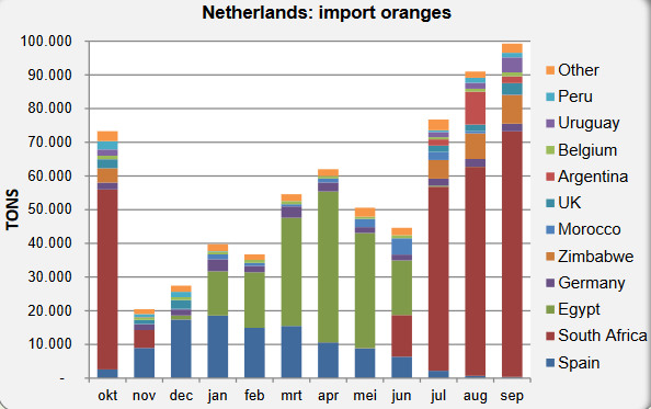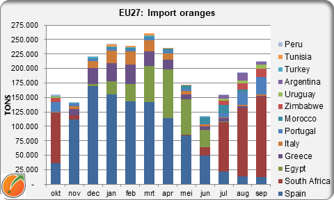 Within the EU27, the Netherlands is, by far, the most important non-EU orange importer. This country is estimated to have imported just under 500,000 tons this past season. That is somewhat less than the season before. Imports from South Africa in 2020/2021 are thought to be between 225,000 to 230,000 tons. That is over ten percent less than 20219/2020's 260,000 tons.