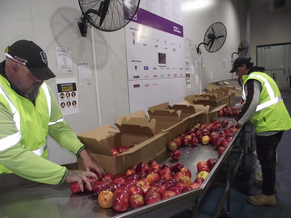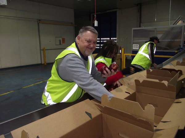 Leigh Royans packing a donation of apples at Foodbank SA's facility at the South Australian Produce Markets
