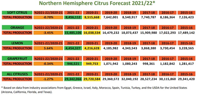 The WCO Secretariat has released its annual Northern Hemisphere Citrus Forecast for the upcoming season (2021-22). The preliminary Forecast is based on data from industry associations from Egypt, Greece, Israel, Italy, Morocco, Spain, Tunisia, Turkey, in addition to the United States (based on USDA reports for Arizona, California, Florida, and Texas). Philippe Binard, Secretary General of WCO stated: “The Forecast shows that the 2021-22 Northern Hemisphere citrus crop is projected to reach 29.342.000 T, which represents a 1.27% decrease compared to the previous season.”