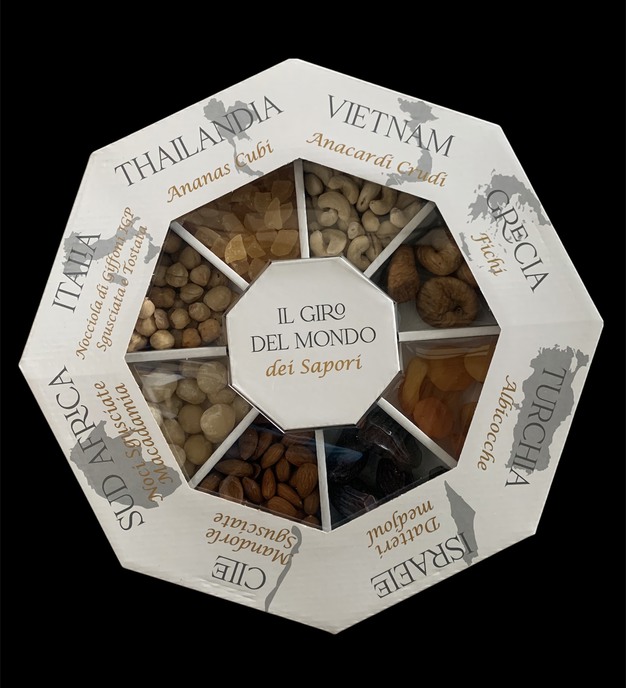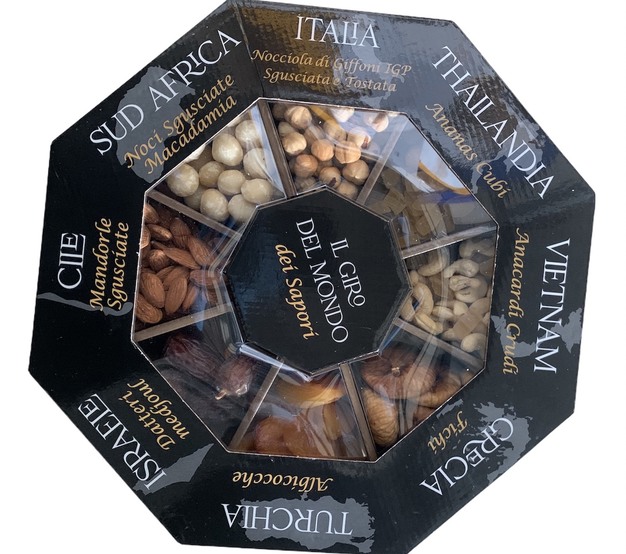 "Christmas is above all a children's holiday, this is why we have put a sweet surprise in our box set - caramelized pop corn, also with cocoa, plus peanuts, almonds, cashew nuts and pistachio praline. Those curious about the Campania culture and traditions or, more simply, the most demanding clients can go on a 'trip around the world' thanks to a selection of 8 products in an octagonal box."