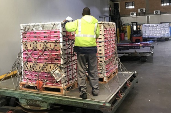 An air freight pallet prepared for a flight from OR Tambo International Airport