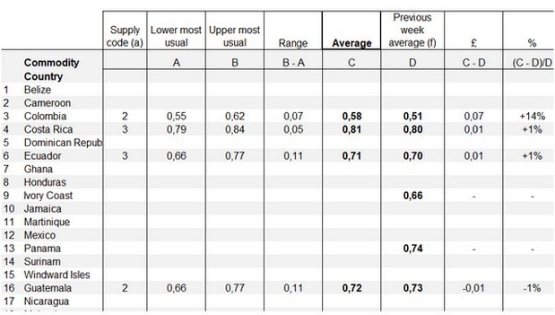 The current average week prices of bananas were at £0.58 for bananas from Colombia, up 14% compared to last week. Bananas from Costa Rica came in at £0.81 / kg, almost steady compared to last week. Ecuadorian bananas sold for £0.71, while bananas from Guatemala cost £0.72 this week.