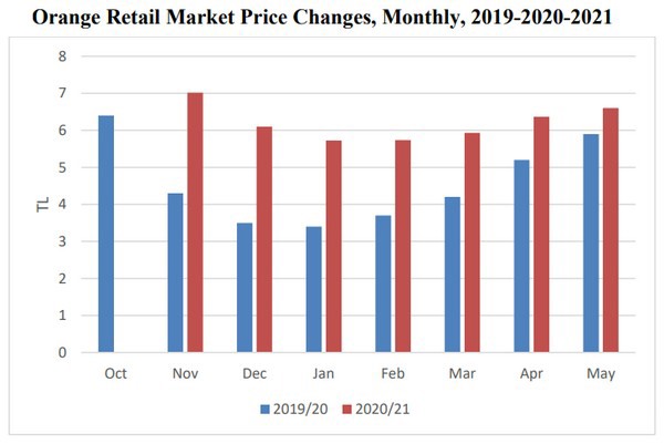 On the other hand, retail prices decreased in January and February 2021 since the GoT applied export restrictions to address EU regulations regarding limited pesticides residues. Many Turkish citrus exports are routinely rejected from the EU and Russia due to maximum residue levels above the importing allowances. Less exports helped the domestic orange market prices to decrease.