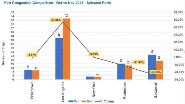Export and import container dwell time data for November 2021 revealed improvements in over 50 percent of the ports tracked compared to October 2021.