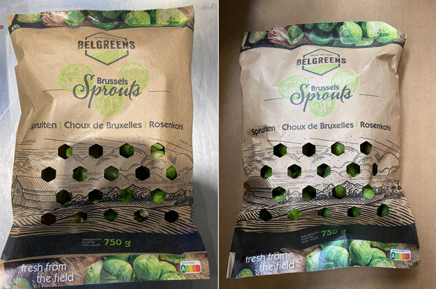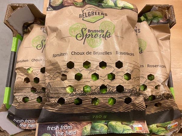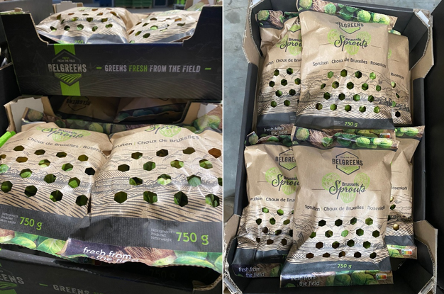 The packages' front is perforated for product visibility. "You obviously can't compare that to flowpack or net bags. Those are in contrast to sustainable, innovative packaging," explains Vanlerberghe. Those perforations also seem to affect the Brussels sprouts' packaged shelf life. "They have a great shelf life in the paper, better than we expected. The perforated paper bag has an advantage. No condensation - which is detrimental to the Brussels sprouts' shelf life - forms in the bag."