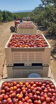 Right: bins of harvested nectarines in a Warm Bokkeveld orchard