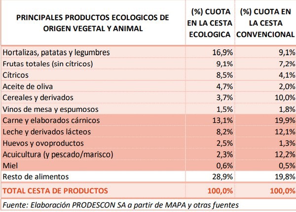 The most consumed organic vegetable products in Spain were fresh fruits, with a share of 15.5% of the organic shopping basket. Fresh vegetables were in second place with 13.9%. This was followed by bread, biscuits and pastries, which together accounted for 6.6% of organic purchases; and oil and wine (4.4% and 2.2% respectively), see Table below.