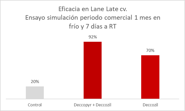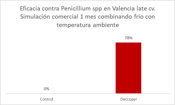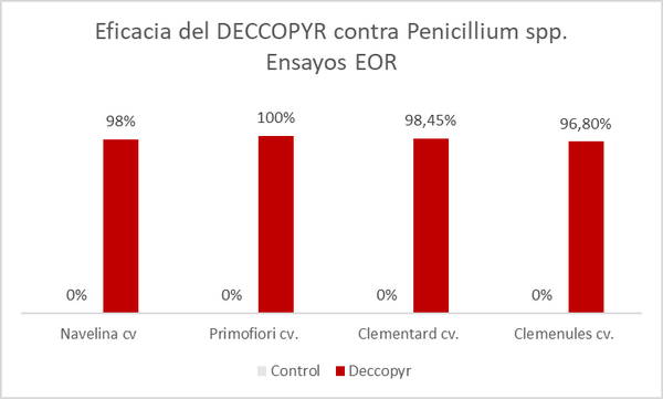 As mentioned above, both Deccopyr and Decco IMZ S-7.5 are complementary products that offer good synergies when combined. Decco IMZ S-7.5 has great control over the sporulation of Penicillium spp. fungi and Deccopyr offers control against strains resistant to the imazalil molecule, and its persistence makes it possible to protect citrus fruits during the entire marketing period.