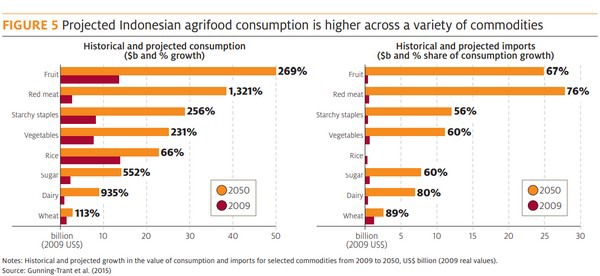 The report found that almost all the expected growth is likely to come from non-staple food products, with the largest absolute increases projected for fruit and vegetables. Growth in fruit consumption in Indonesia is expected to rise by 269 per cent by 2050, while fruit imports are projected to rise by 67 per cent. In terms of vegetables, consumption is tipped to rise by 231 per cent, with imports up by 60 per cent, over the next 28 years.