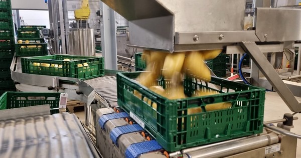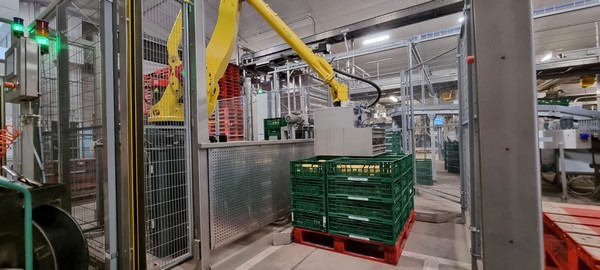 Moespom has another extra option. Namely: filling the folding crates with loose potatoes immediately after unfolding. The filled folding crates are then transported directly to Lan Handling's palletiser. The folding crates can be placed in two pallet docks on different pallet sizes, both EURO and block pallets. In this way optimal use is made of the existing crate supply line.