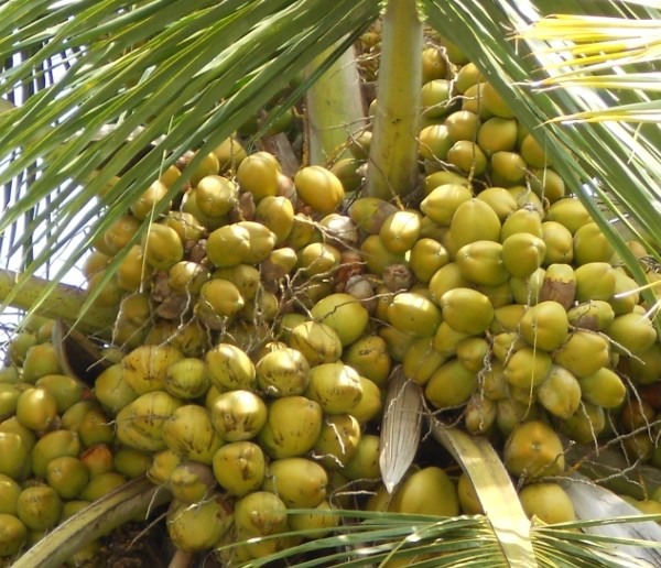 Coconut tree with large crop of coconuts. This is a picture from the 2011-2012 season. This year harvest size is predicted to be a bumper crop, similar to 10 years ago