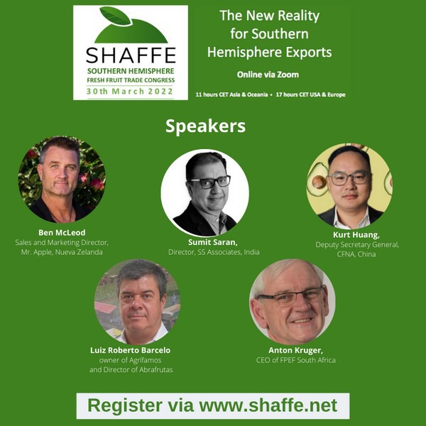 SHAFFE, the Southern Hemisphere Association for Fresh Fruit Exporters will be hosting the 2nd Southern Hemisphere Fresh Fruit Trade Congress 2022 which will take place on the 30th of March 2022 via an online format, with the guiding theme “The new reality of Southern Hemisphere Exports”. The program of the event will explore the rising costs impacting fresh fruit exporters and growers in the region, the opportunities, and challenges in mega markets such as India and China, the current state of play of sustainability requirements in Europe and the US and will outline the Southern Hemisphere season outlook for 2022 / 2023.