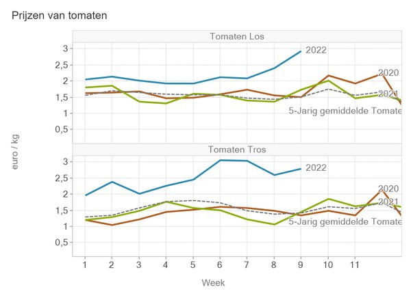 A similar image is formed by updates of German wholesale market prices. There too, tomatoes are priced well above previous levels. Also, in week 9, prices were often up from weeks 7 and 8. Relative to 2021, tomatoes cost as much as €1 more. See Germany's Federal Agency for Agriculture and Food figures here.