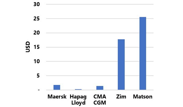 Another way of looking at it is shown in the figure above, where we have calculated how much additional tax in TEU is paid whenever the pre-tax income per TEU increases by 100 USD. The difference is very clear to see. For the big three carriers, every time the pre-tax profit increases by 100 USD/TEU, the taxation increases 0.30-1.80 USD/TEU. For ZIM and Matson, the increase in taxation as the pre-tax profit goes up by 100 USD/TEU is 18 and 26 USD/TEU, respectively.