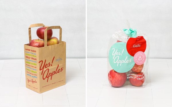 Left: This fall, Yes! Apples will launch updated paper totes made from recyclable and compostable paper; right: The company’s new plastic bags are now made with up to five percent less plastic.