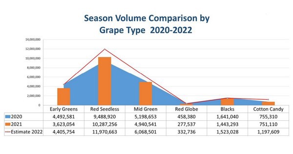 The largest volume is red seedless varieties at 46.9 percent followed by white seedless varieties at 41.08 percent, then black seedless varieties at 5.97 percent and cotton candy at 4.70 percent.