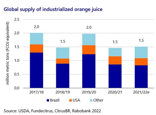 According to a recent Rabobank report, the global supply of industrialized orange juice declined to around 1.5m metric tons frozen concentrated orange juice (FCOJ) equivalent for both the 2020/21 and 2021/22 seasons, close to the lowest levels seen over the past ten years.