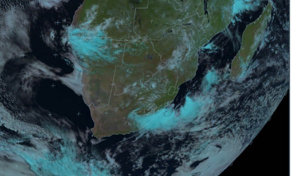 Satellite image on 12 April 2022, "clearly indicating the cyclonic swirl of deep convective cloud, associated with heavy rain, just off the southern coastline KwaZulu-Natal", according to the South African Weather Service (copyright: Eumetsat)