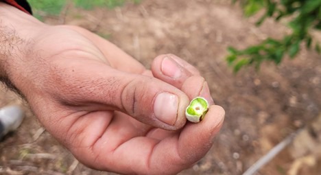 "Still fruit will drop of the trees. As you can see, the ¨stone¨  is a black/brown color, which means it was frozen and these fruits will drop off eventually. So even if you see fruit hanging on the tree right now, a big part will not survive in the future." Van Groningen states.