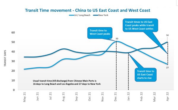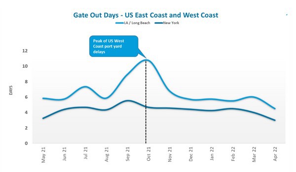While congestion outside the ports has shifted to the East Coast, the container gate-out times have improved on both coasts. Los Angeles/Long Beach gate-out times improved by 28 percent dropping from 5.74 days in Jan ‘22 to 4.5 days in Apr ‘22 while New York had a 47 percent drop in container gate from 4.25 days in Jan ‘22 to 3 days in Apr ‘22.
