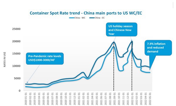 Container spot rates fell sharply on the back of the combined impact of reduced demand in the U.S. and Chinese exports affected by pandemic-induced shutdowns in Shanghai.
