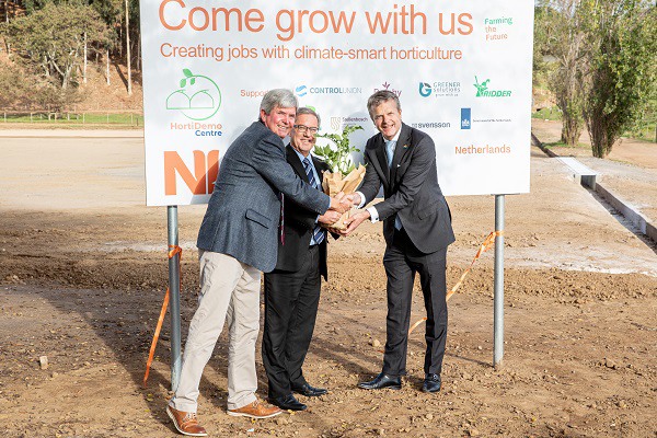 On 11 May 2022 the cornerstone for the Horti Demo Centre on the grounds of the University of Stellenbosch was laid with the symbolic handing over of a tomato plant and cutting of a ribbon by Mr Guido Landheer, director-general at the Dutch Ministry of Agriculture, alongside Prof Nick Kotze and Prof Eugene Cloete of the University of Stellenbosch.