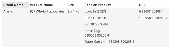 The Alasko brand IQF Whole Raspberries are being recalled due to norovirus contamination.