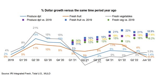 Fresh produce prices were up from last year, at +8.0 percent level on a per-unit basis and +7.0 percent on a per-pound basis. Unlike the beginning of the year where inflation was predominantly driven by fruit, it was vegetables that reached +8.2 percent inflation in June 2022 versus June 2019.
