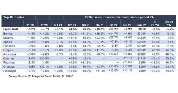 “Berries had slight dollar sales in June of +0.8 percent but pounds were flat,” Parker said. “Mixed fruit and mandarins dropped out of the top 10 and peaches and pineapples made inroads. Volume sales were a mix with increases for grapes, oranges and pineapples but down results for all other top 10 sellers.”