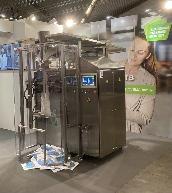 Rovema offers solutions for paper with a sliver of sealant - a food-grade PE layer that is also a moisture barrier - on the bag's end or over its entire surface. Besides this, this company has the technology to hot melt bags' ends together, so only 100% paper is used.