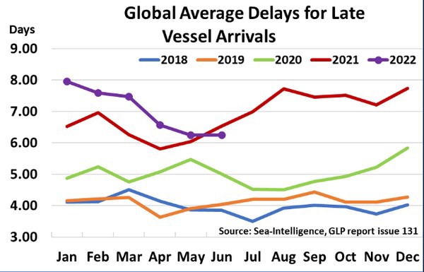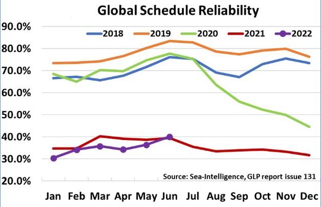 Sea-Intelligence has published issue 131 of the Global Liner Performance (GLP) report, with schedule reliability figures up to and including June 2022. As the report itself is quite comprehensive and covers schedule reliability across 34 different trade lanes and 60+ carriers, this press release will only cover the global highlights from the full report.