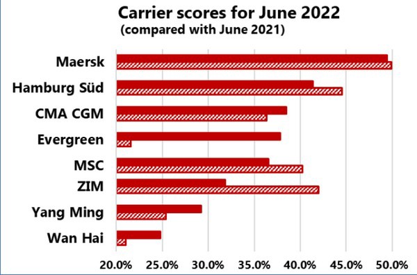 On a Y/Y level, nine of the top-14 carriers recorded an improvement in schedule reliability in June 2022, with Evergreen recording the only double-digit improvement of 16.2 percentage points.