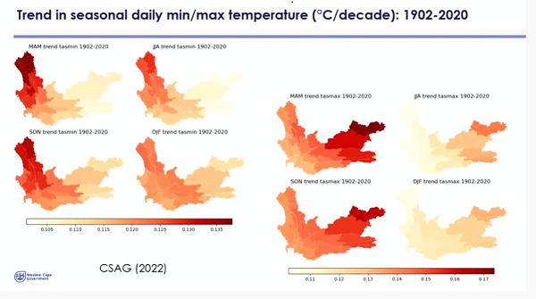 The main area of concern is up the West Coast and Koue Bokkeveld during autumn and spring season. Rainfall shows a decreasing trend in autumn when, she said, “we’re seeing a very clear drying in autumn.”